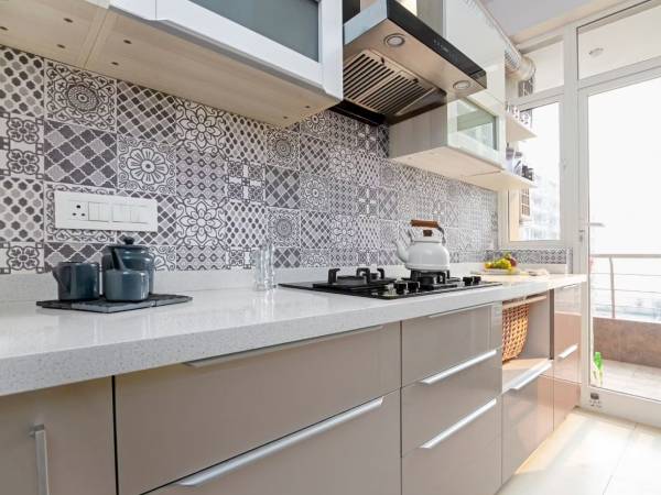 A stunning 2BHK flat with a sleek beige and white parallel kitchen design. Bold accents like cushions and curtains bring life to the neutral-toned living space, while the patterned glass panels add sophistication to the dining area, completing the stylish look.