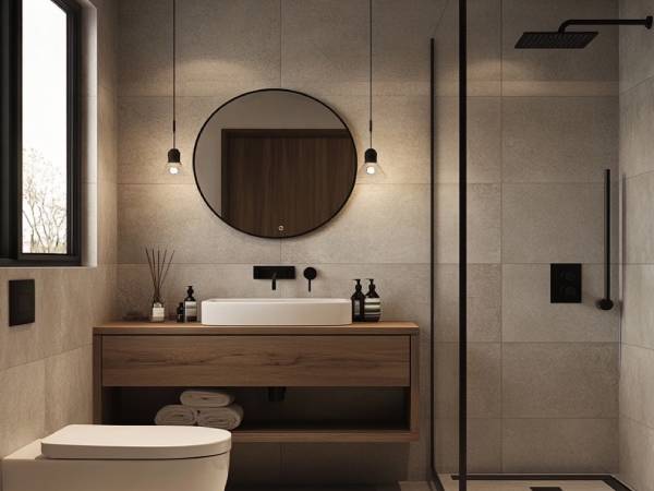 – The combination of drawer and open storage ensures functionality, while the contrast between the rich wood tones and cool grey tiles creates a balanced, contemporary aesthetic.