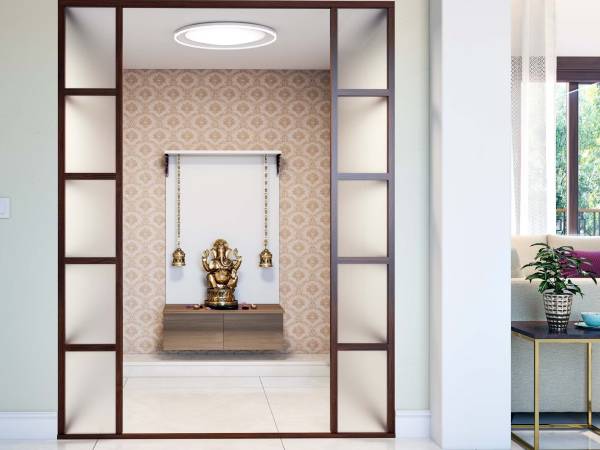 Storage Features: The design includes a compact wall-mounted Pooja unit featuring a sturdy wooden countertop, offering a practical space for arranging offerings while seamlessly integrating with the overall aesthetics.